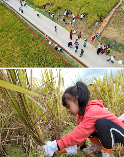 現場最熱鬧的要數水稻田里,孩子們帶著手套、手持鐮刀,在工作人員的指導和父母的幫助下一把一把地割水稻、打稻谷,稻田里的一堂課讓孩子們親身感受收獲的喜悅和“粒粒皆辛苦”的不易。