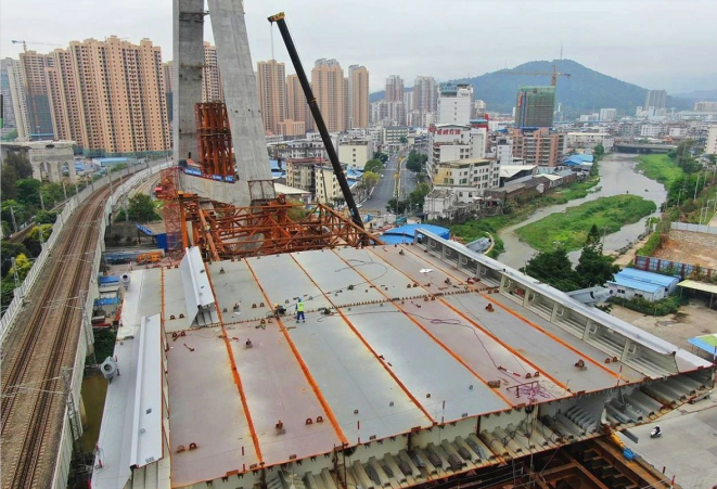大橋鋼箱梁工程還有19片箱梁,鋼箱梁總長340米,每片質量平均290噸,計劃8月初全部完成吊裝。與此同時,主塔第一次轉體計劃于4月中旬實施,第二次轉體計劃在8月底,確保年底大橋通車。