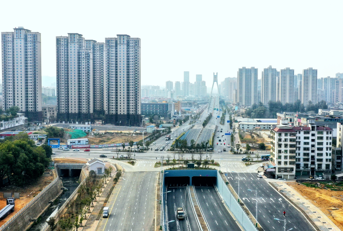 龍巖大橋全線通車后,交通流量劇增,龍巖大道與工業路交叉口成為新的交通擁堵點。市政府組織市住建局、自然資源局提前謀劃,通過對該交叉口標高及縱坡分析,采用龍巖大橋主路下穿、輔道信號燈控制的渠化立交方案。該工程起始于農產品物流配送中心路口,終止于龍巖大道四期龍巖第一技師學院東側,全長841米,其中下穿通道為分離式通道,雙向六車道,凈寬13米,長度470米,同時,在主通道兩側設置了兩道南北向人行通道, 人行通道斷面型式為5×3.5米,方便居民、學校學生出行。