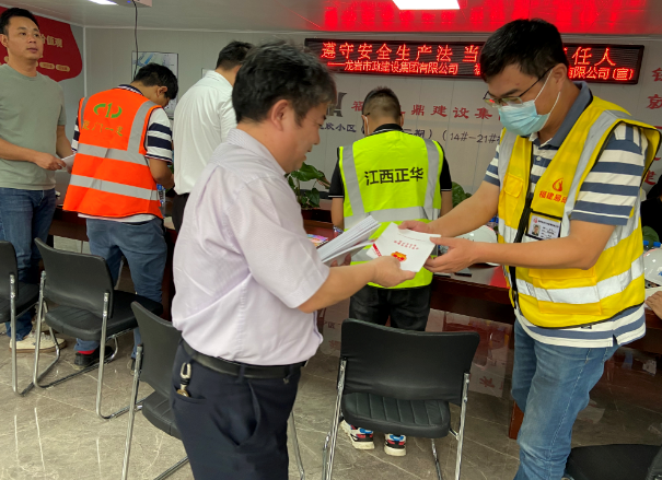 現(xiàn)場徐旺興董事長、修海金副總經理分別向項目部人員及工人現(xiàn)場分發(fā)《安全生產法》及“五進”等宣傳資料。