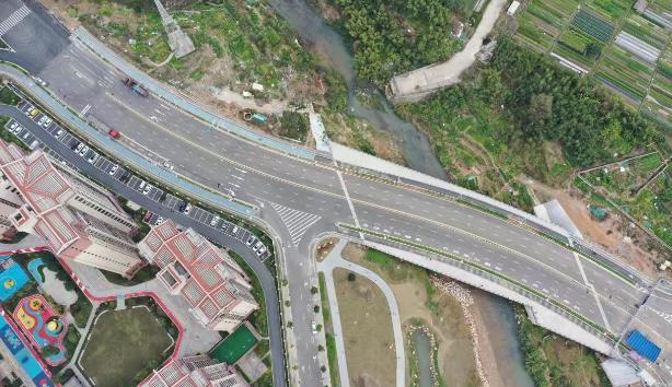 羅橋節(jié)點(diǎn)改造提升工程2019年11月開工建設(shè),2021年8月建成通車。該項(xiàng)目沿北環(huán)西路、龍興路設(shè)置南北分離式雙向四車道高架,南側(cè)接龍興路,北側(cè)接現(xiàn)狀北環(huán)西路,高架靠東側(cè)布置(緊貼烈士陵園),橋梁總長(zhǎng)約1140米,凈寬約7.7米;在雙洋路、龍川北路、北環(huán)西路設(shè)置人行天橋,與山體步道銜接,以完善慢行系統(tǒng);在烈士陵園山體下采用明挖回填方式設(shè)置框涵,長(zhǎng)度約225米,凈寬10.75米工程投資1.4億元。