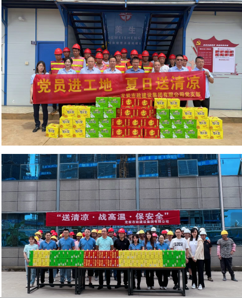 82122市政集團(tuán)黨支部書記董事長總經(jīng)理孔華同志領(lǐng)公司領(lǐng)導(dǎo)班子成員及黨員志愿者小分隊(duì)分別前往園田塘蓄洪濕地工程浮蔡安置小區(qū)和龍欣安置小區(qū)等項(xiàng)目開展送清涼·戰(zhàn)高溫·保安全慰問活動高溫天氣下仍奮戰(zhàn)在一線的勞動者們送去300件的防暑降溫物資